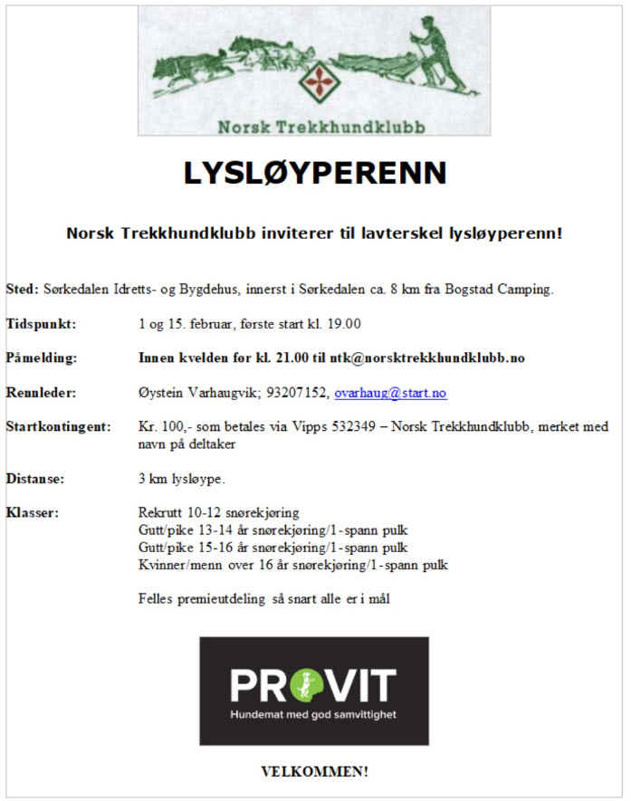 Norsk Trekkhundklubb inviterer til lavterskel lysløyperenn!Sted: Sørkedalen Idretts- og Bygdehus, innerst i Sørkedalen ca. 8 km fra Bogstad Camping.